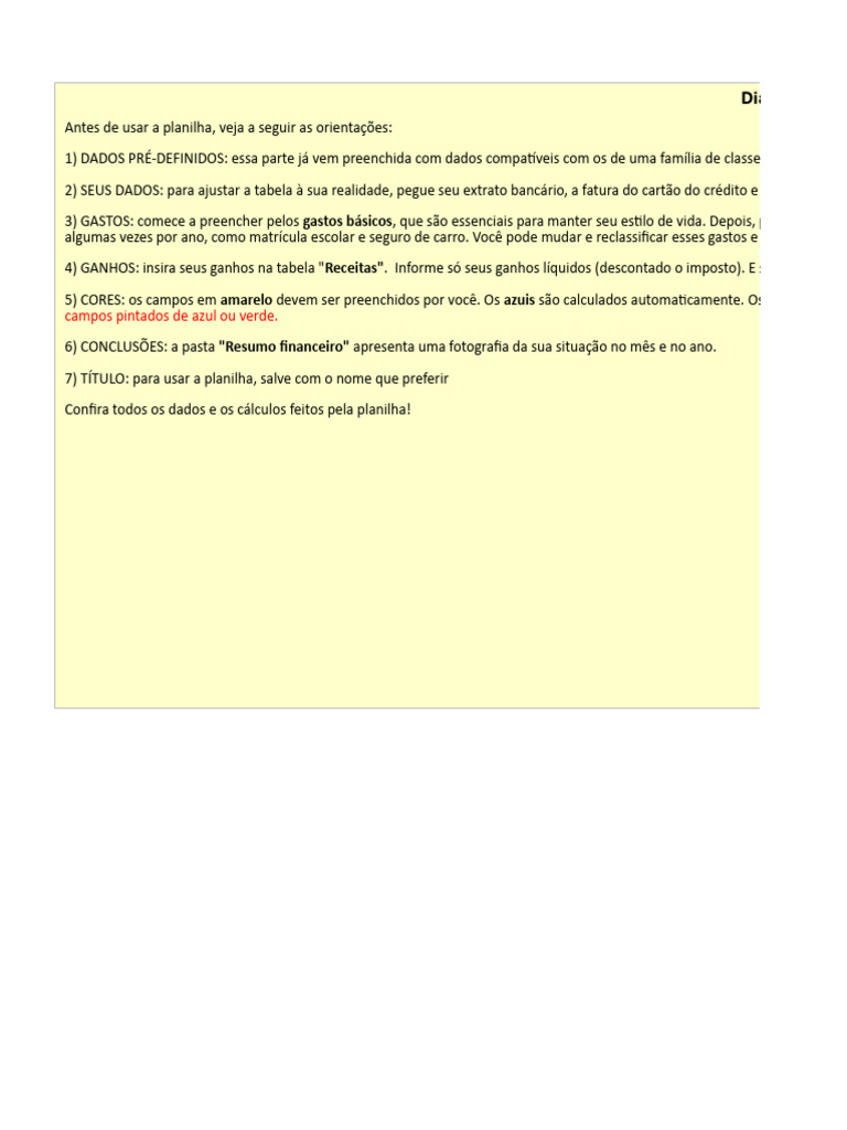 5) CORES: os campos em amarelo devem ser preenchidos por você. Os azuis são calculados automaticamente. Os totais estão e