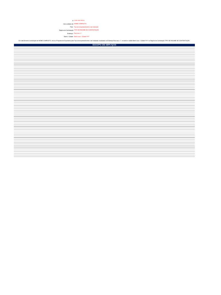 Em atendimento a solicitação de NOME COMPLETO, envio a Proposta de Orçamento para Tipo de empreendimento a ser realizado, localizado no Endereço:Rua xxxx, n°, no bairro e cidade Bairro xxxx - Cidade YYY no Regime de Contratação TIPO DE REGIME DE CONTRATAÇÃO.