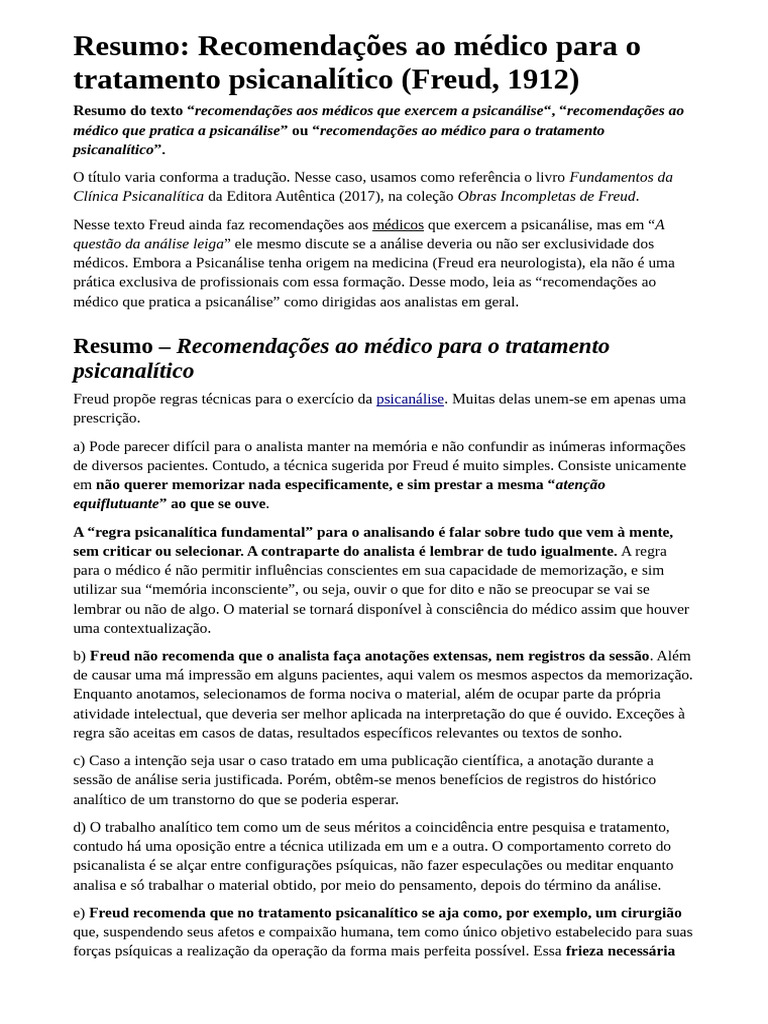 Resumo do texto “recomendações aos médicos que exercem a psicanálise“, “recomendações ao