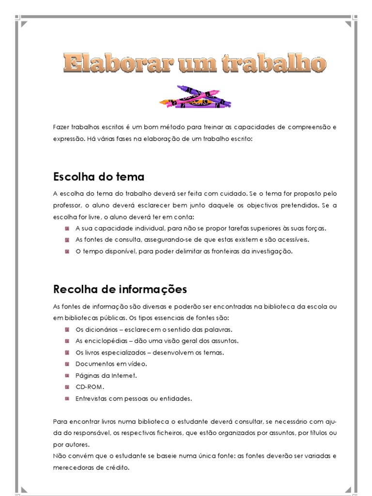 A escolha do tema do trabalho deverá ser feita com cuidado. Se o tema for proposto pelo