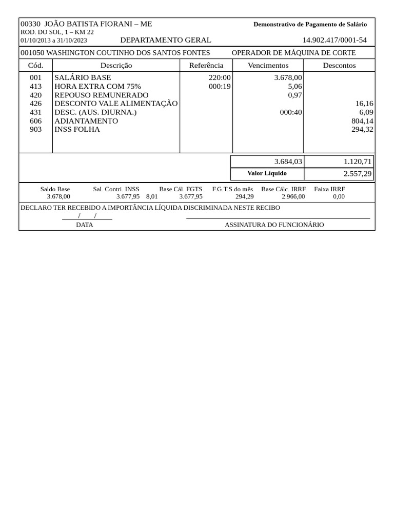 001050 WASHINGTON COUTINHO DOS SANTOS FONTES OPERADOR DE MÁQUINA DE CORTE