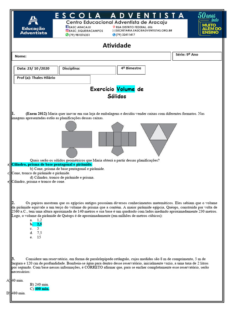 1. (Enem 2012) Maria quer inovar em sua loja de embalagens e decidiu vender caixas com diferentes formatos. Nas