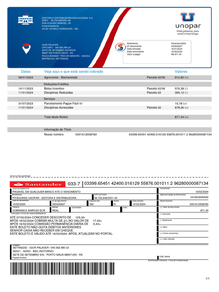 08/01/2024 Agronomia - Bacharelado Parcela 02/06 912.80 (+)