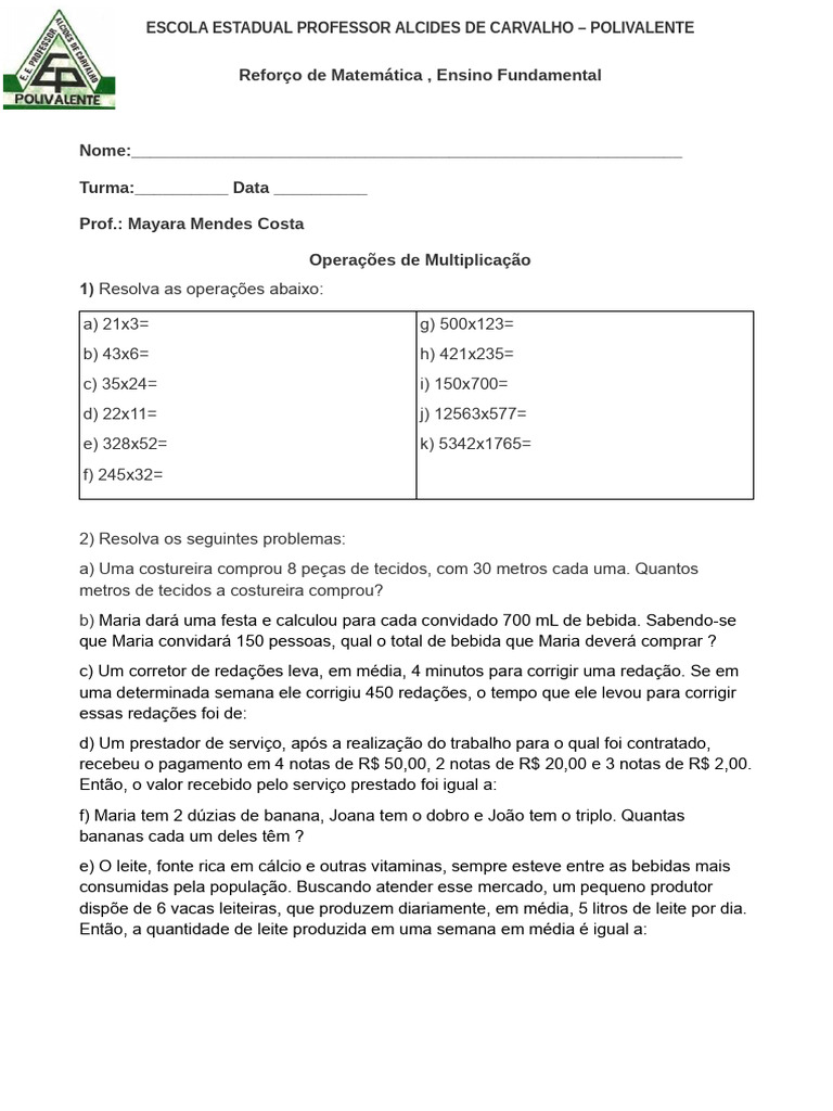 2) Resolva os seguintes problemas: