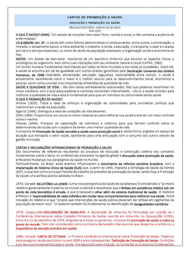 CARTAS E DECLARAÇÕES INTERNACIONAIS DE PROMOÇÃO A SAUDE