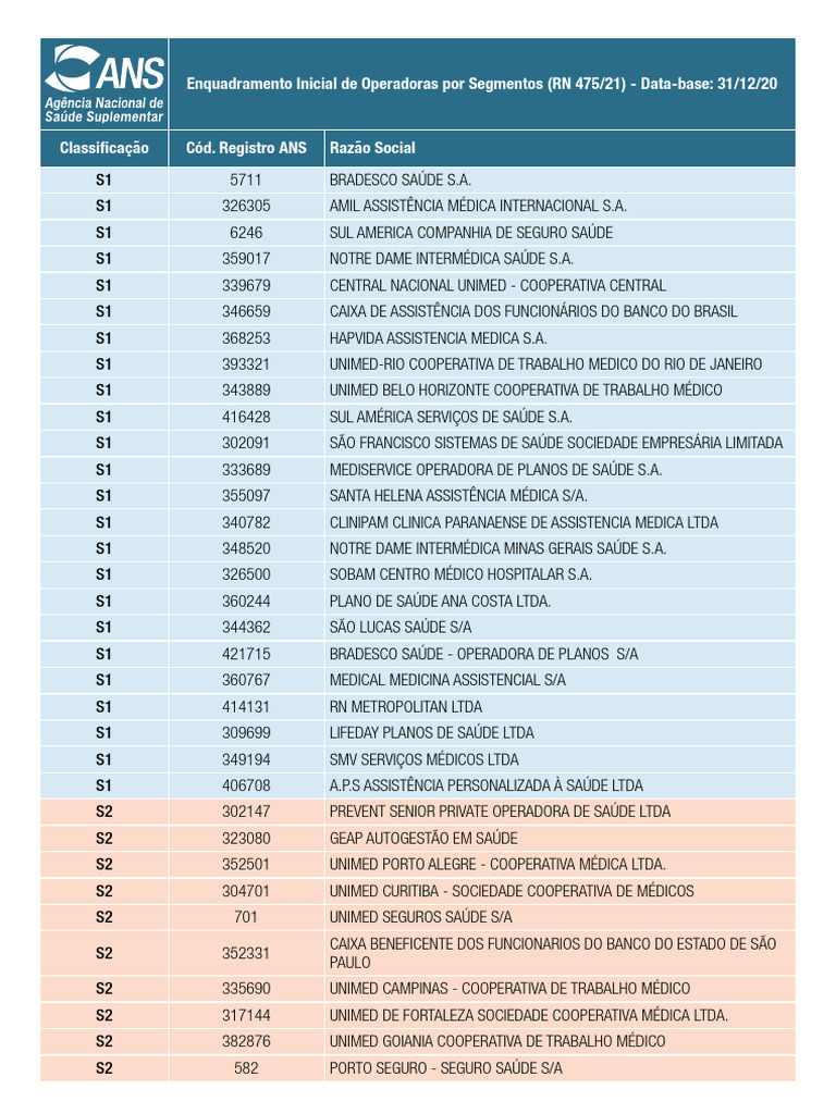 Enquadramento Inicial de Operadoras por Segmentos (RN 475/21) - Data-base: 31/12/20