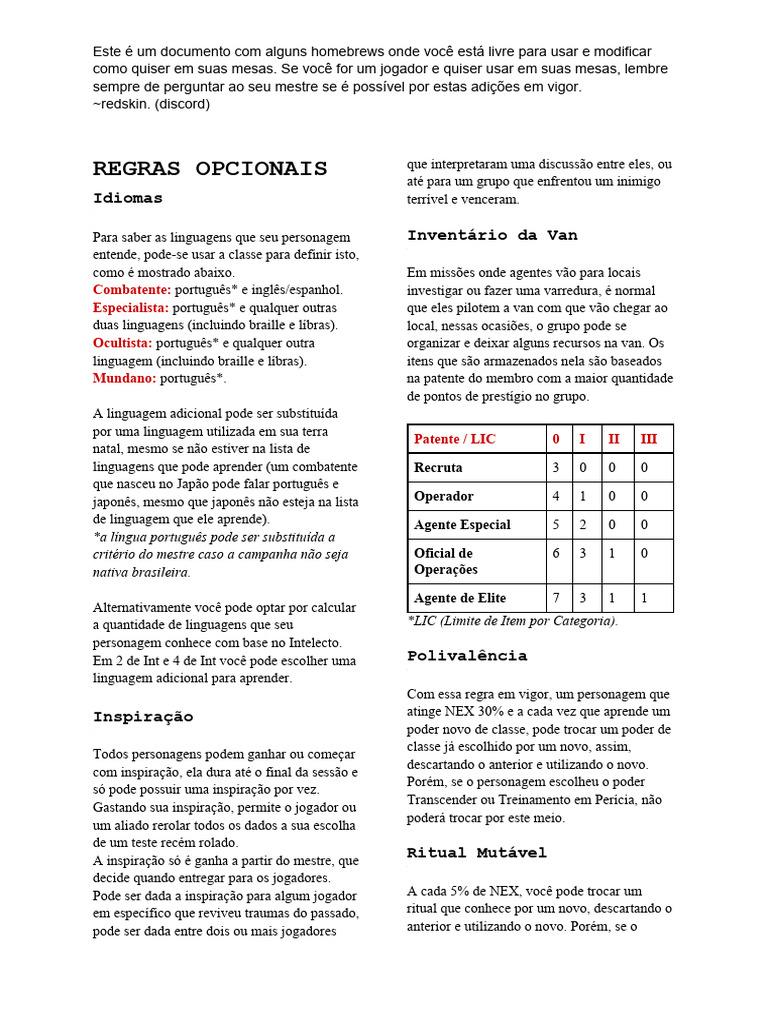 AGI 3 ◆ FOR 1 ◆ INT 0 ◆ PRE 2 ◆ VIG 3 INTIMIDAÇÃO 2d20+7