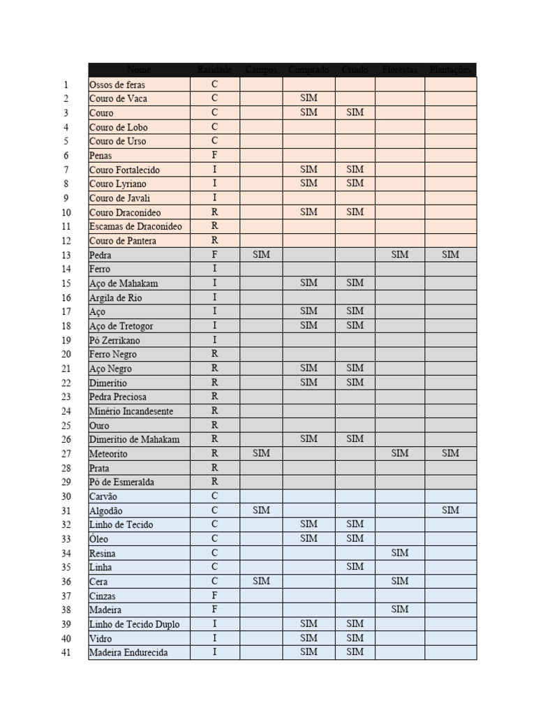 Nome Raridade Campos Comprado Criado Florestas Plantações