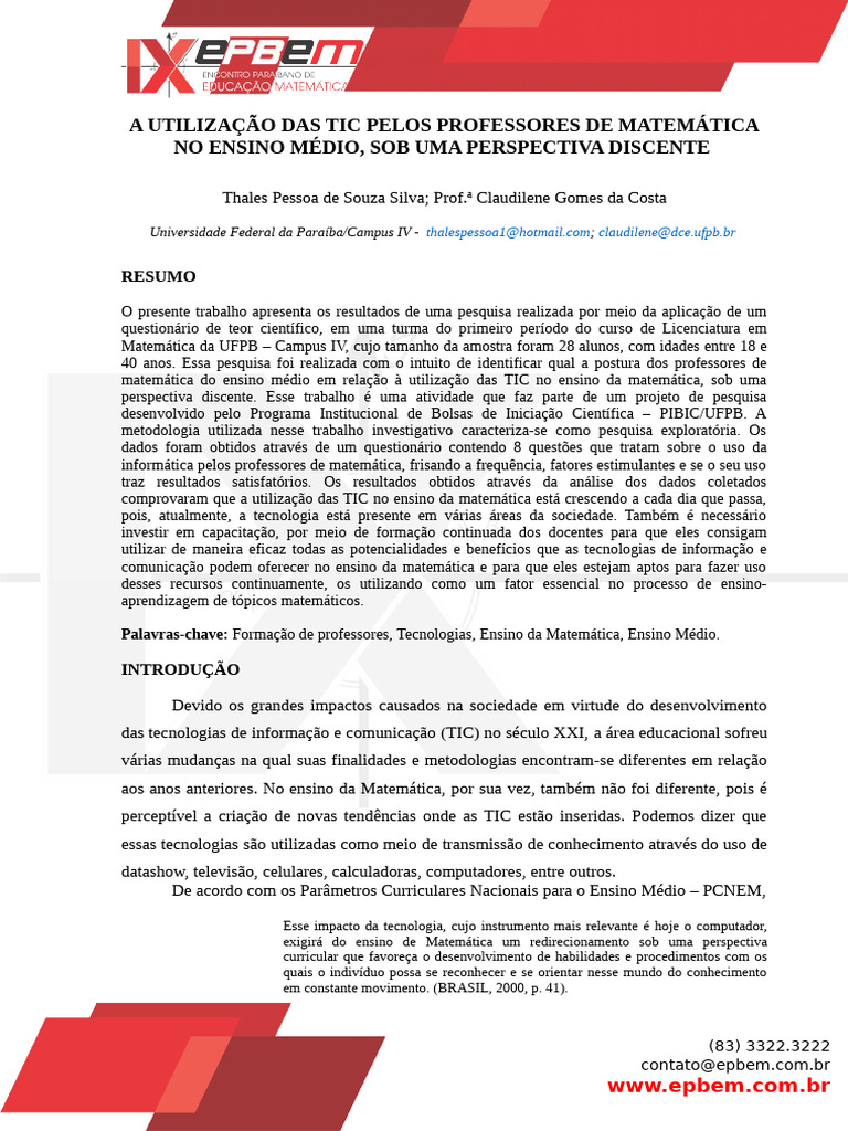 Palavras-chave: Formação de professores, Tecnologias, Ensino da Matemática, Ensino Médio.