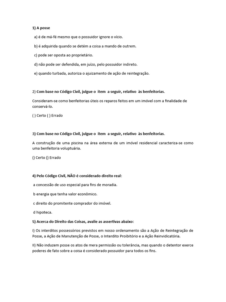 5) Acerca do Direito das Coisas, avalie as assertivas abaixo: