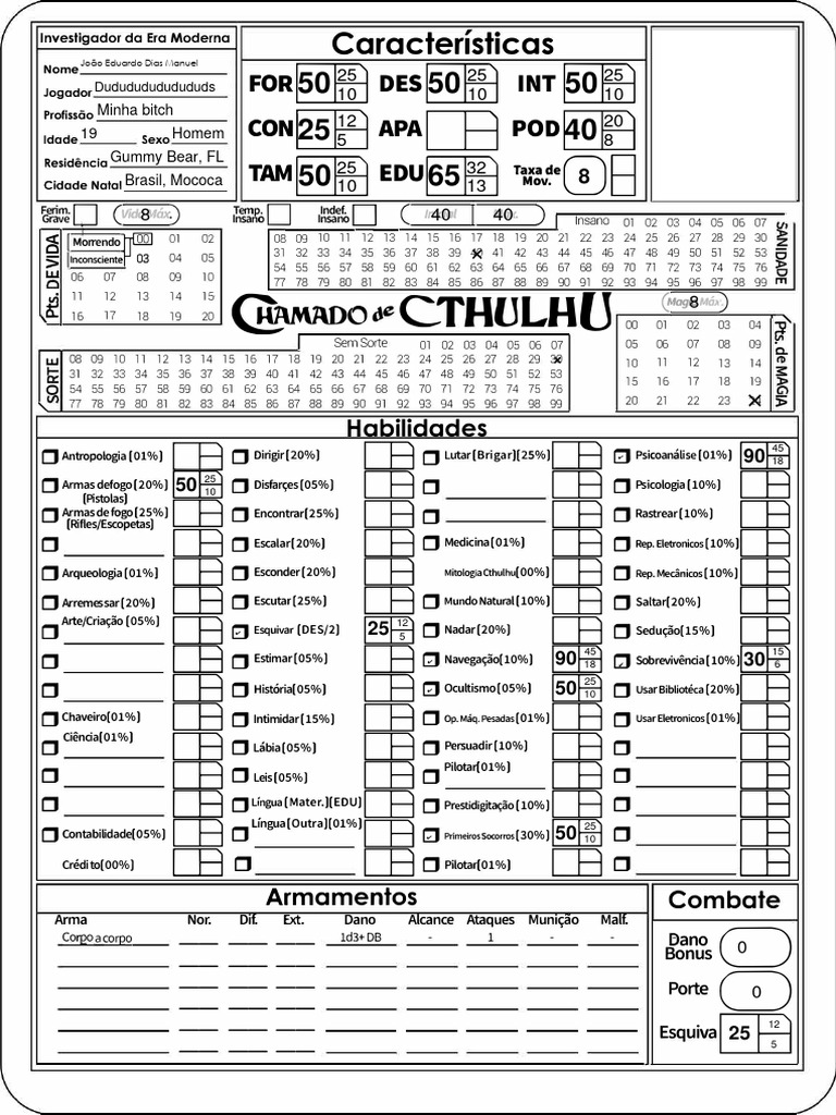 Esquivar (D ES/2) 25 Nadar(20%) Seduc;ao[15%)