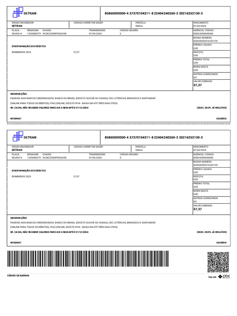 DETRAN 85860000000-4 37370104311-8 22404240260-3 30216252130-3