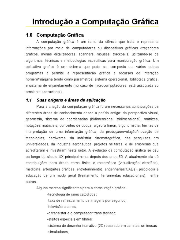 A computao grfica um ramo da cincia que trata e representa informaes por meio de computadores ou dispositivos grficos (traadores grfcos, mesas diitalizadoras, scanners, mouses, trackballs) utilizando-se de algoritmos, tcnicas e metodologias especficas para manipulao grfica. Um aplicativo grafico um sistema que pode ser composto por vrios outros programas e permite a representao grfica e recursos de interao homem/mquina tendo como parametros: sistema operacional, biblioteca grafica, e sistema de enjanelamento (no caso de microcomputadores, est associada ao ambiente operacional).