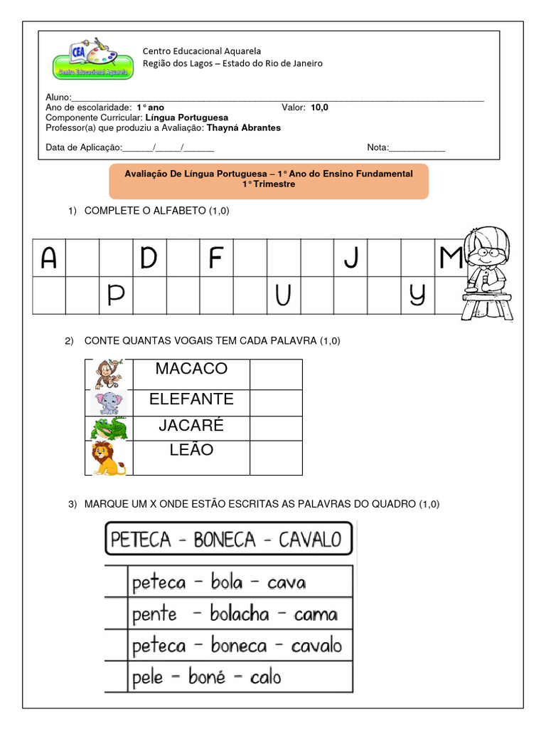 Avaliação De Língua Portuguesa – 1° Ano do Ensino Fundamental
