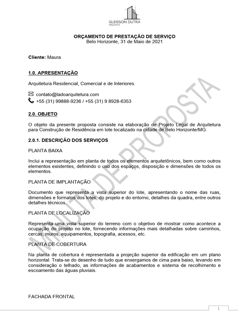 O objeto da presente proposta consiste na elaboração de Projeto Legal de Arquitetura