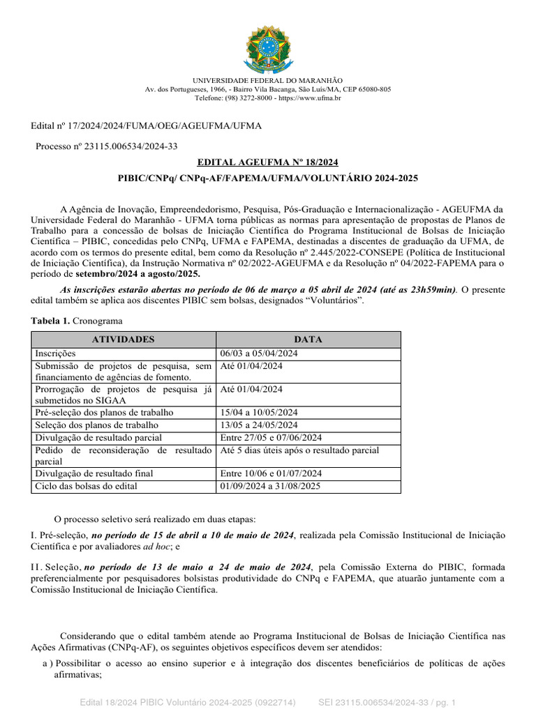 Edital 18/2024 PIBIC Voluntário 2024-2025 (0922714) SEI 23115.006534/2024-33 / pg. 1