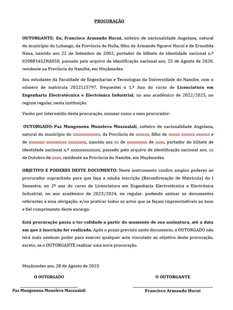 OUTORGANTE: Eu, Francisco Armando Hucui, solteiro de nacionalidade Angolana, natural