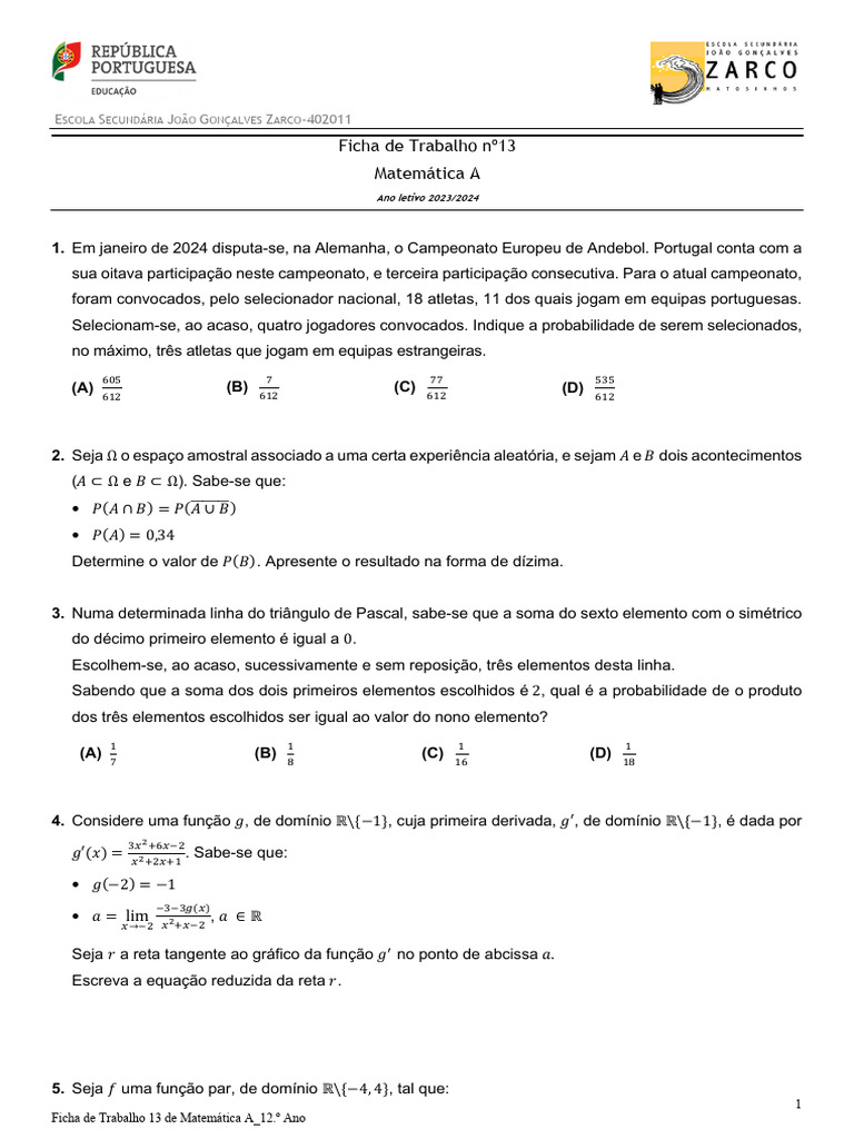 1. Em janeiro de 2024 disputa-se, na Alemanha, o Campeonato Europeu de Andebol. Portugal conta com a