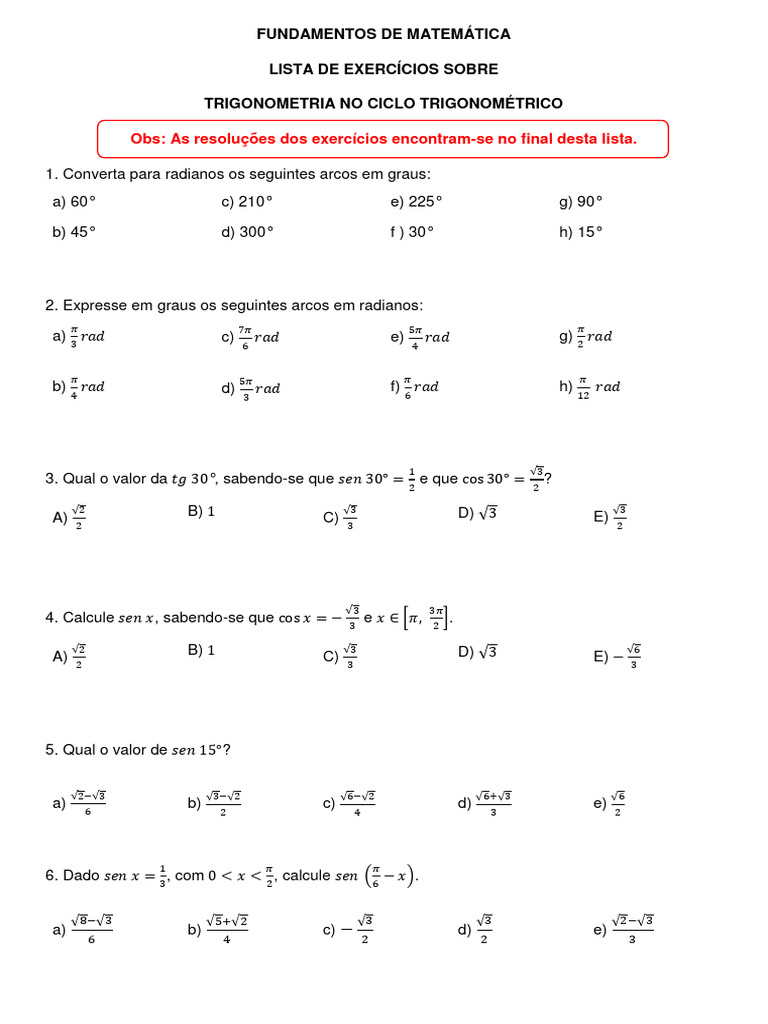 1. Converta para radianos os seguintes arcos em graus: OBS: Considerando que