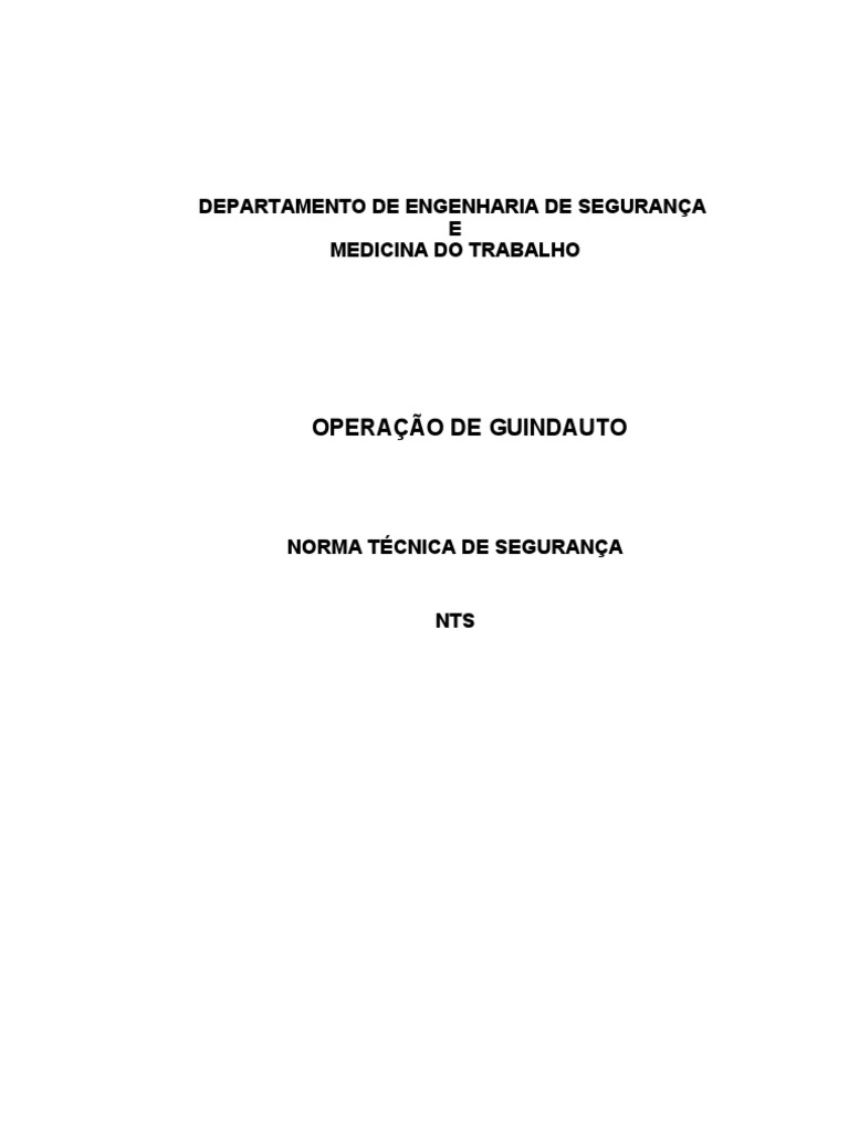 1. OBJETIVO 1.1. O objetivo desta Norma Tcnica de Segurana -NTS fixar as condies mnimas exigveis para operao de Guindauto. 2. APLICAO 2.1. Esta NTS aplica-se e/ou sub contratadas. 3. DEFINIO 3.1. Guindauto um guindaste montado sobre chassis de caminho, dimensionado para realizar trabalhos de elevao e transferncia de materiais, com princpios de funcionamento por braos articulados e telescpicos atuados por cilindros hidrulicos. 3.1.1. CARACTERSTICAS TCNICAS