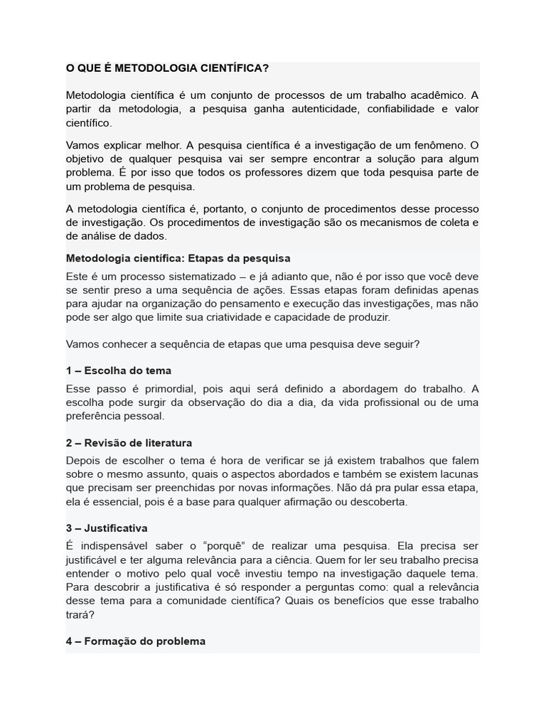 Metodologia científica é um conjunto de processos de um trabalho acadêmico. A