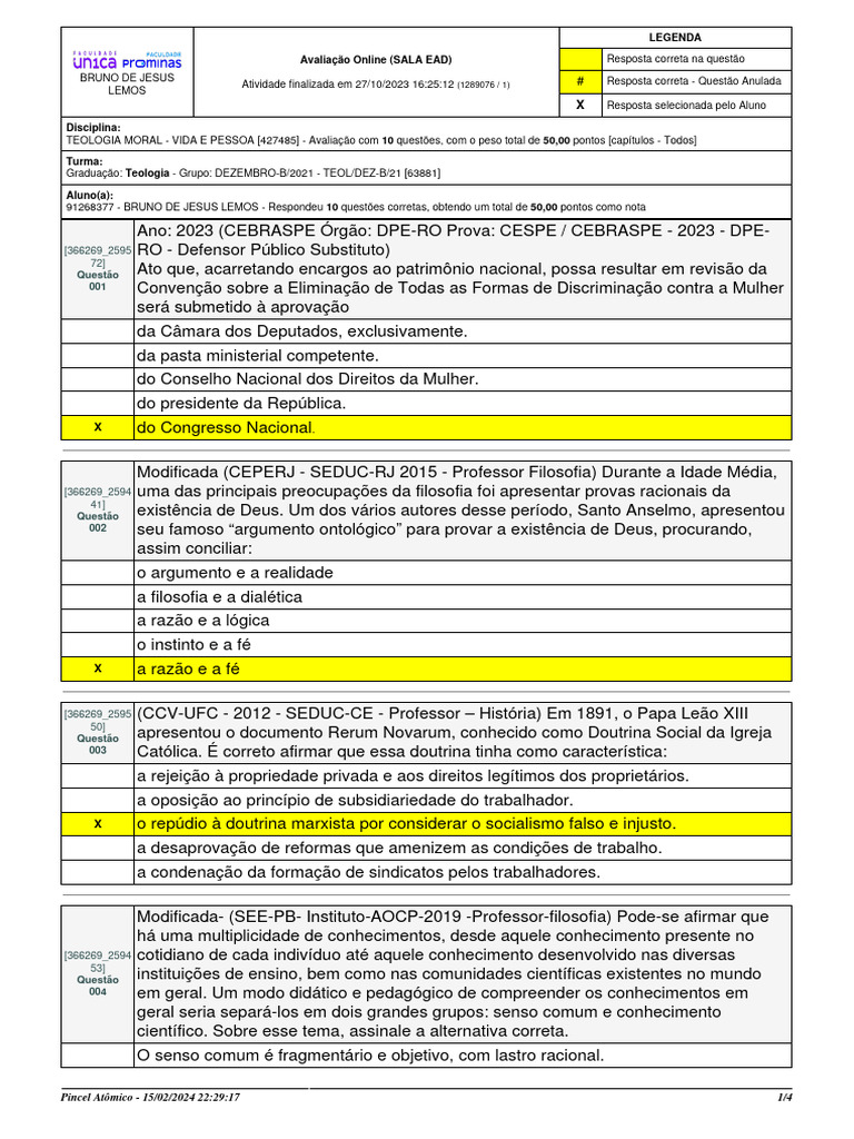 TEOLOGIA MORAL - VIDA E PESSOA [427485] - Avaliação com 10 questões, com o peso total de 50,00 pontos [capítulos - Todos]