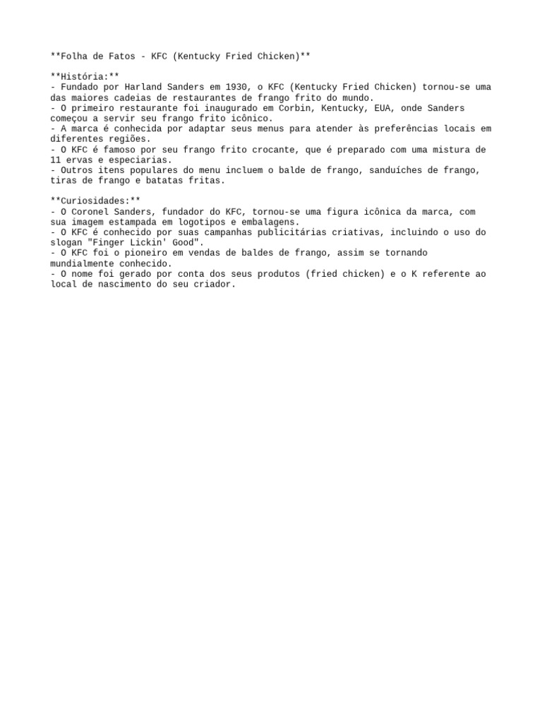 **Folha de Fatos - KFC (Kentucky Fried Chicken)**