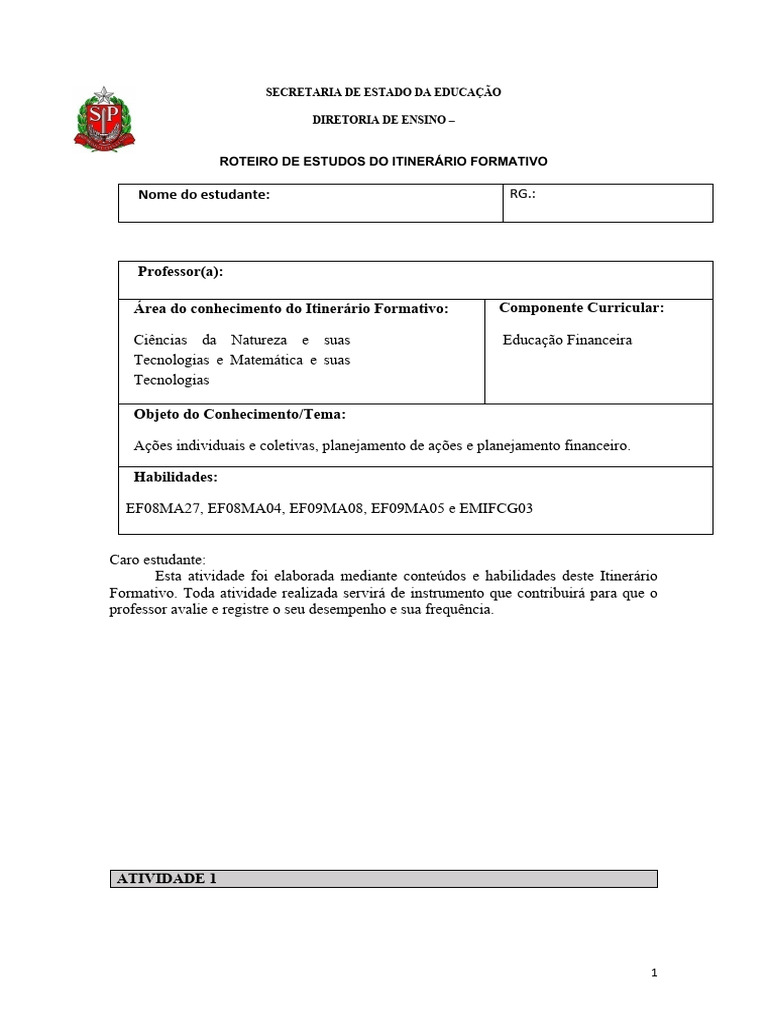 Esta atividade foi elaborada mediante conteúdos e habilidades deste Itinerário