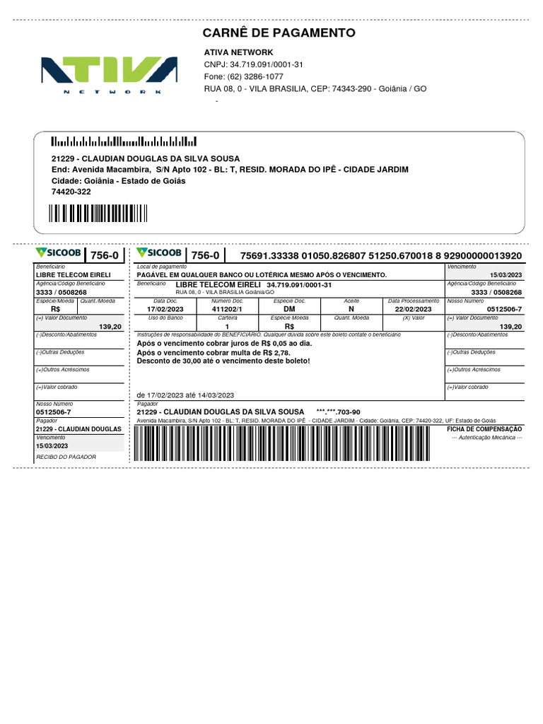 LIBRE TELECOM EIRELI PAGÁVEL EM QUALQUER BANCO OU LOTÉRICA MESMO APÓS O VENCIMENTO. 15/03/2023