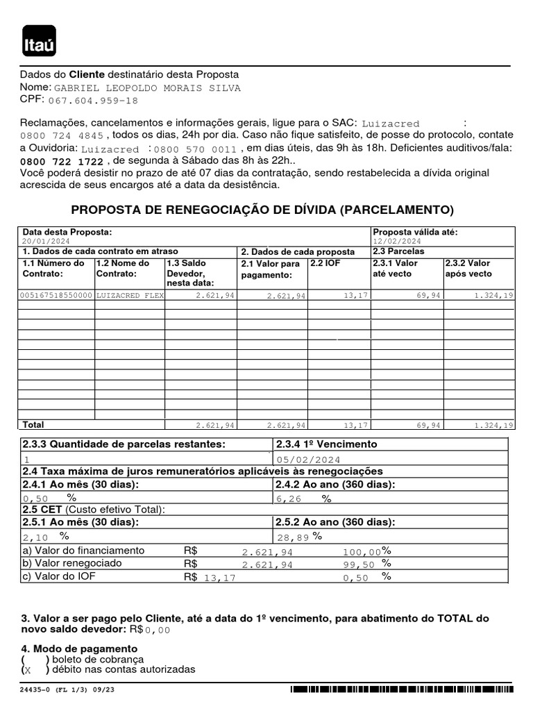 PROPOSTA DE RENEGOCIAÇÃO DE DÍVIDA (PARCELAMENTO)