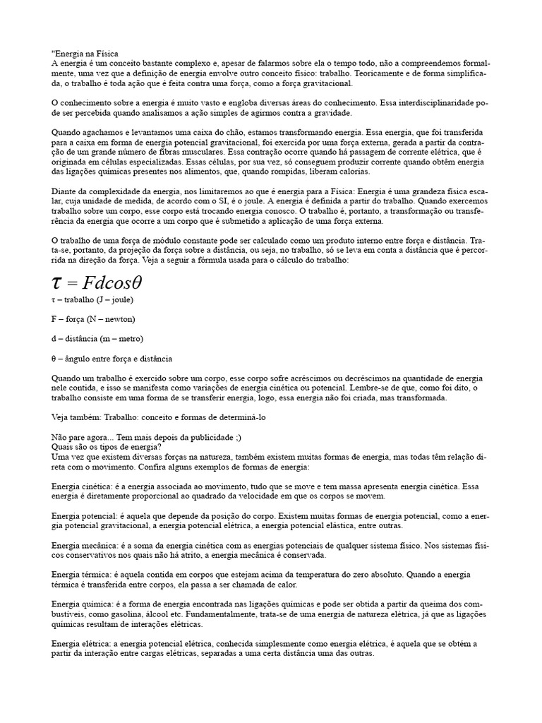 Diante da complexidade da energia, nos limitaremos ao que é energia para a Física: Energia é uma grandeza física esca-