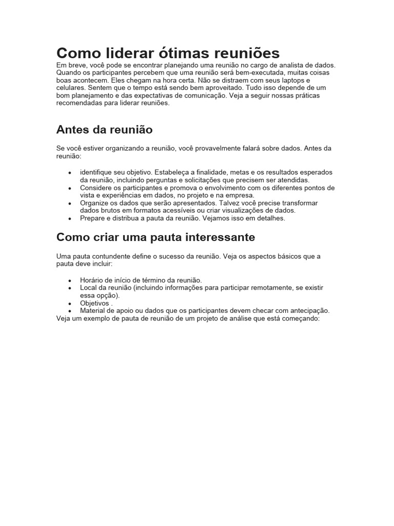 Veja um exemplo de pauta de reunião de um projeto de análise que está começando: