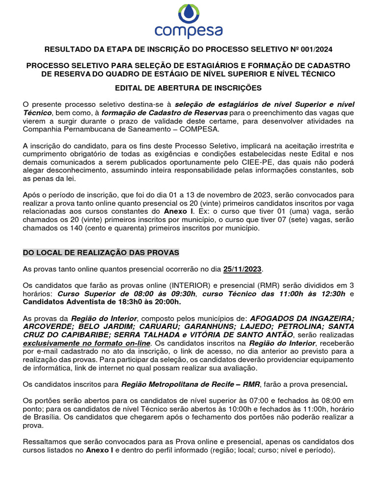 demais comunicados a serem publicados oportunamente pelo CIEE-PE, das quais não poderá