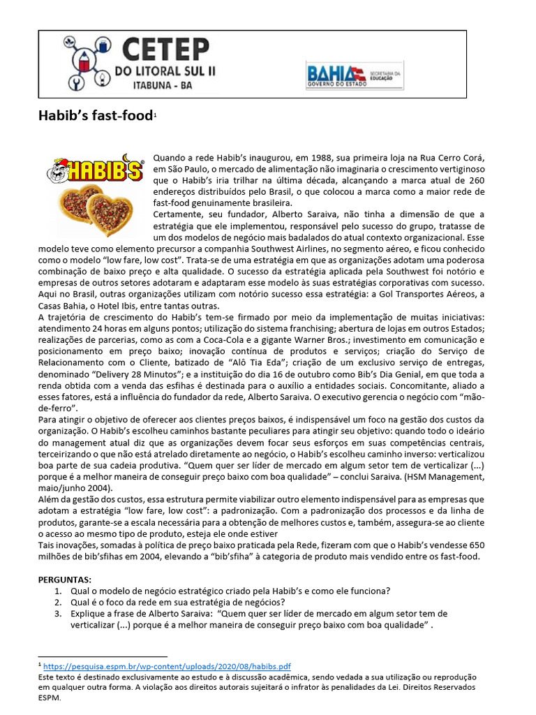 1. Qual o modelo de negócio estratégico criado pela Habib’s e como ele funciona?