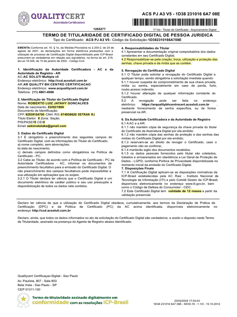 Tipo do Certificado: ACS PJ A3 V5 - Código da Solicitação: 1D382310166A708E