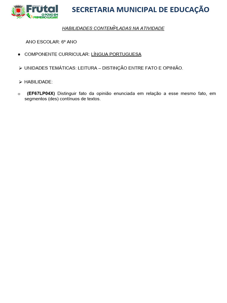 o (EF67LP04X) Distinguir fato da opinião enunciada em relação a esse mesmo fato, em