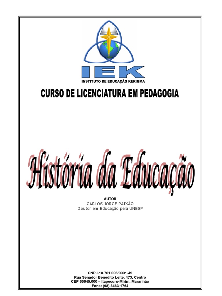 Histria da Educao LE GOFF, J. A histria nova. So Paulo: Martins Fontes, 1990. LOMBARDI, J. C. (Org.). Pesquisa em educao: histria, filosofia e temas transversais. 2. ed. Campinas: Autores Associados/ HISTEDBR, 2000. LOPES, E. M. T. Perspectivas histricas da educao. 2. ed. So Paulo: tica, 1989. LUZURIAGA, Lorenzo. Histria da educao e da pedagogia. So Paulo: Nacional, 1990. MANACORDA, Mrio. Histria da educao: da antigidade at nossos dias. 6. ed. So Paulo: Cortez, 1997. MANOEL, I. A. Igreja e educao feminina: uma face do conservadorismo. So Paulo: Editora da UNESP, 1996. MENDES, J. M. A. A histria como cincia. 3. ed. Coimbra: Coimbra, 1993. MENDES, R. T. A universidade. Rio de Janeiro: Tipografia do Apostolado Positivista do Brasil, 1903. MENDES, R. T.; LEMOS, M. Contra o ensino obrigatrio. 2. ed. Rio de Janeiro: Templo da Humanidade, 1902. MENDES, R.T. Benjamin Constant: esboo de uma apreciao sinttica da vida e da obra do fundador da Repblica Brasileira. Rio de Janeiro: Imprensa Nacional, 1937. MOACYR, P. A instruo e o imprio. So Paulo: Cia. Editora Nacional, 1937. NOGUEIRA, N. G. ; LIMA, J. M. (Org.) O ideal republicano de Benjamin Constant. Rio de Janeiro: Tip. do Jornal do Comrcio, 1936. OLIVEIRA, E. R. O exrcito e o positivismo: identidade e autonomia poltica. In: Pro-posies, Revista da Faculdade de Educao/ UNICAMP, 1990. PAIM, A . Histria das idias filosficas no Brasil. 2. ed. So Paulo; 1974. PAIVA, Jos Maria. Colonizao e Catequese: 1549-1600. So Paulo: Autores Associados: Cortez, 1982. PAIVA, Jos Maria. Colonizao e Catequese: 1549-1600. So Paulo: Autores Associados: Cortez, 1982. PAIXO, C. J. A moral positivista e o pensamento educacional no Brasil do sculo XIX. So Lus: Cd - Rom do XV EPENN / UFMA, 2001. _____ O positivismo e a educao no Brasil. FFC/UNESP, 1998. ______ . A moral positivista e o pensamento educacional no Brasil do sculo XIX. Anais do XV Encontro de Pesquisa Educacional das Regies Norte e Nordeste. Universidade Federal do Maranho, So Lus MA, 2001. ______ . Caminhando no territrio da histria. Estudos Humanidades: Revista da Universidade Catlica de Gois, Goinia, vol. 30, n. 3, p. 445-53, mar. 2003. ______ . Caminhando no territrio da histria. Estudos Revista da UCG. Goinia, v. 30, n. 3, p. 445 453, mar. 2003a. RIBEIRO, M. L. Histria da educao brasileira: a organizao escolar. 11. ed. So Paulo: Cortez, 1991. ______ . A sociedade urbano-industrial e o desafio da constituio do ensino popular (1910 a 1990). In.: XAVIER, M. E. (Org.). Histria da educao: a escola no Brasil. So Paulo: FTD, 1994. ROMANELLI, O. O. Histria da educao no Brasil. 26. ed. Petrpolis: Vozes, 2001. SAMPAIO, Maria Regina Maneschy. A universidade (e a escola) tardia no Brasil: o perodo colonial. Revista de Cultura do Par. Belm, v. 13, n.1. SANFELICE, J. L. et al. Histria da educao: perspectivas para o intercambio internacional. Campinas: Autores Associados, 1999. SANFELICE, J. L. et al. Histria da educao: perspectivas para o intercambio internacional. Campinas: Autores Associados, 1999. SCHORSKE, C. Pensando com a histria. So Paulo: Companhia das Letras, 2000. TOBIAS, J. A. Histria da educao brasileira. 2. ed. So Paulo: Juriscredi, s/d.