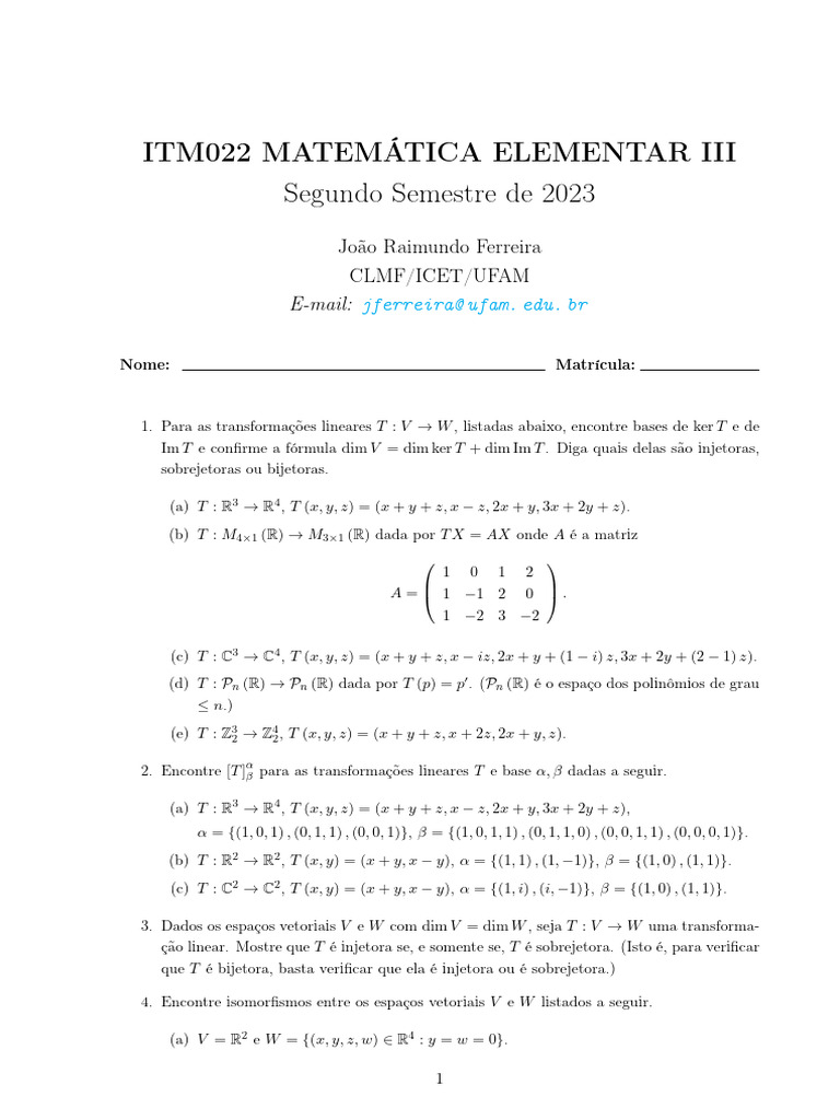 1. Para as transformações lineares T : V → W , listadas abaixo, encontre bases de ker T e de