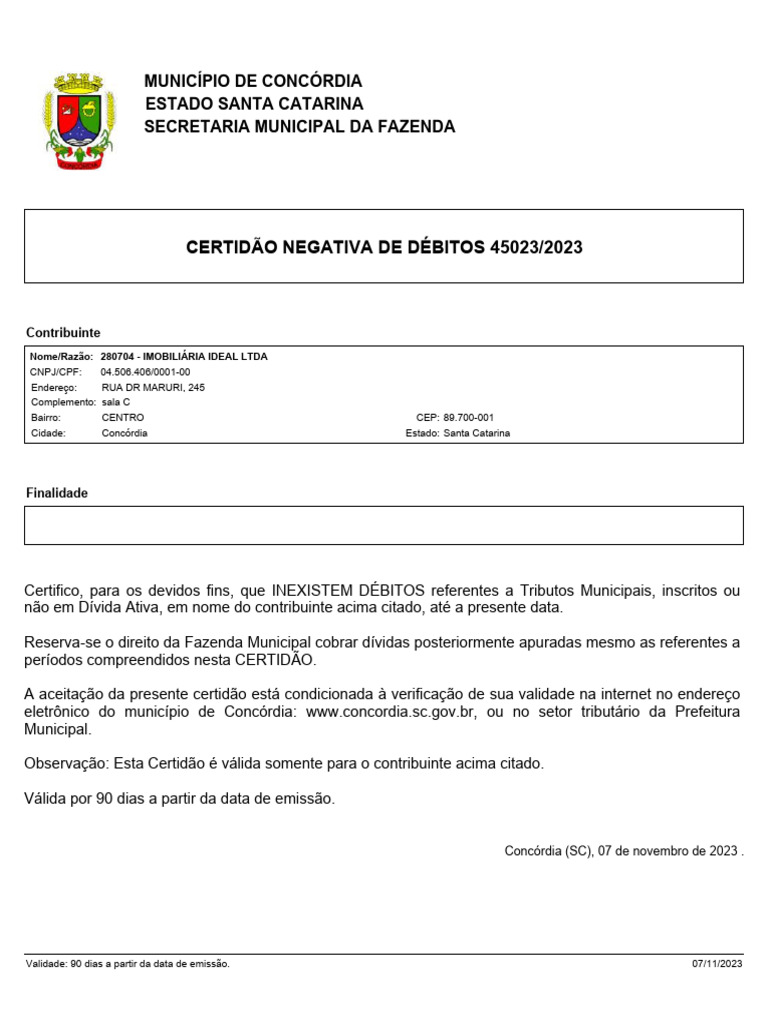 Validade: 90 dias a partir da data de emissão. 07/11/2023