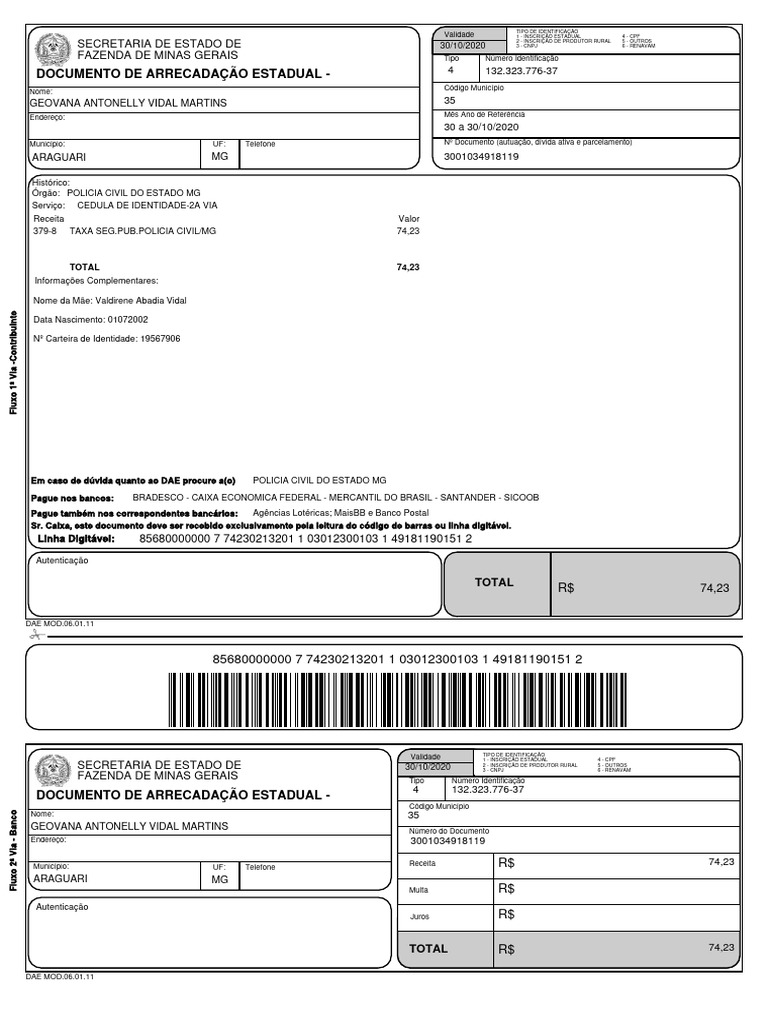 Em caso de dúvida quanto ao DAE procure a(o) POLICIA CIVIL DO ESTADO MG