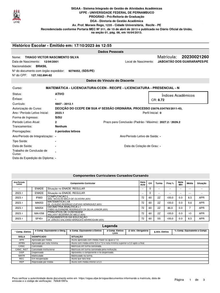 Para verificar a autenticidade deste documento entre em https://sigaa.ufpe.br/sigaa/documentos informando a matrícula, data de Página 3 de 3