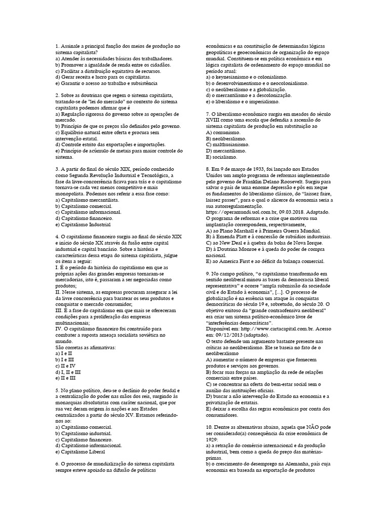 a) Capitalismo comercial. 10. Dentre as alternativas abaixo, aquela que NÃO pode
