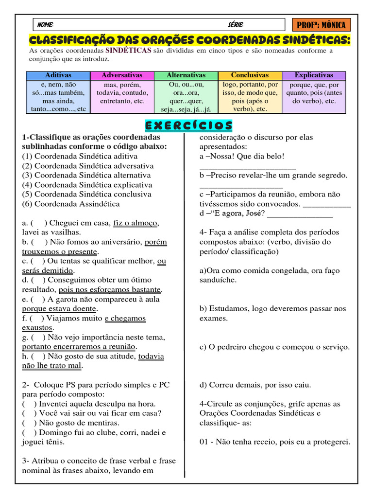 CLASSIFICAÇÃO DAS ORAÇÕES COORDENADAS SINDÉTICAS: