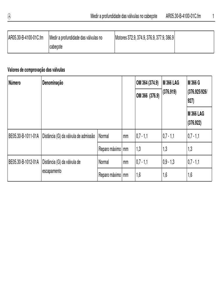 BE05.30-B-1012-01A Distância (G) da válvula de Normal mm 0,7 - 1,1 0,9 - 1,3 0,7 - 1,1