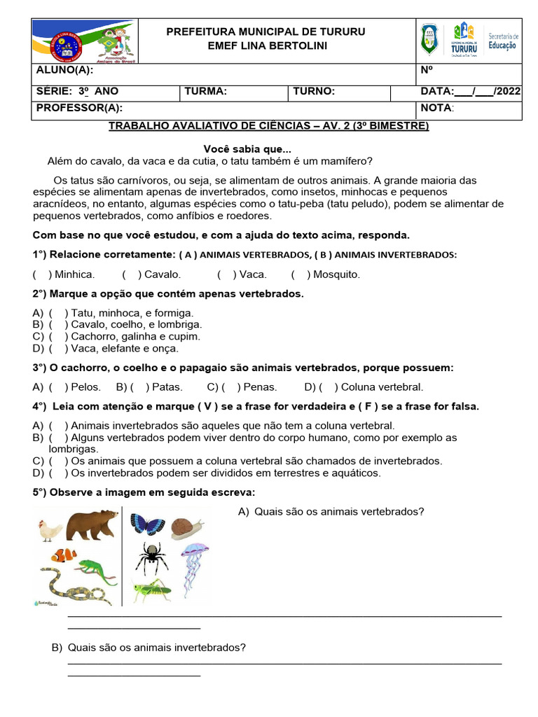 1°) Relacione corretamente: ( A ) ANIMAIS VERTEBRADOS, ( B ) ANIMAIS INVERTEBRADOS: