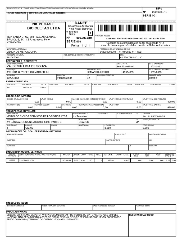 BICICLETAS LTDA Nota Fiscal Eletrônica