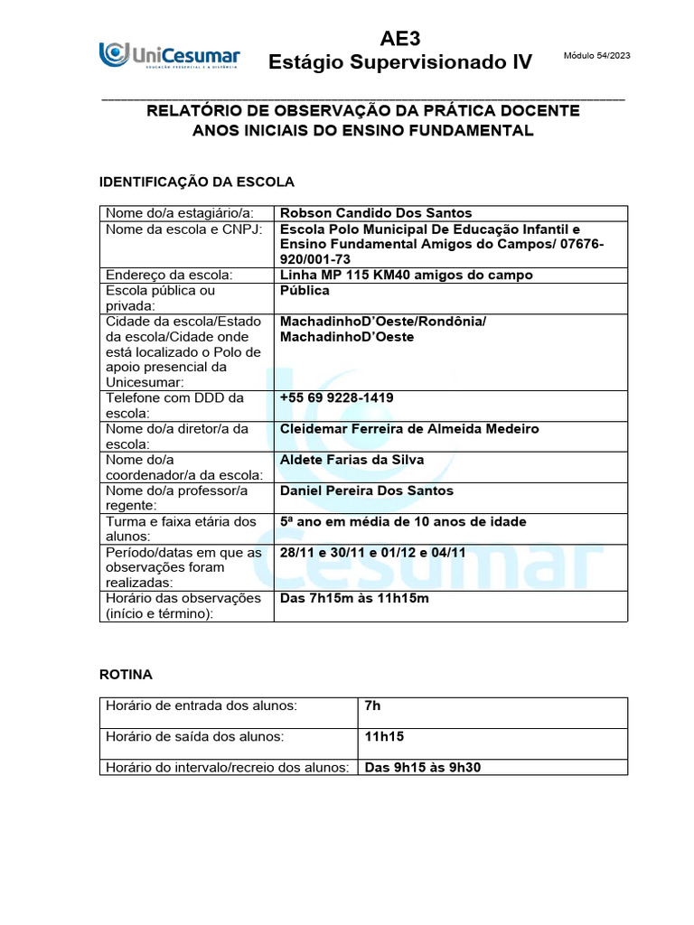 Nome do/a estagiário/a: Robson Candido Dos Santos