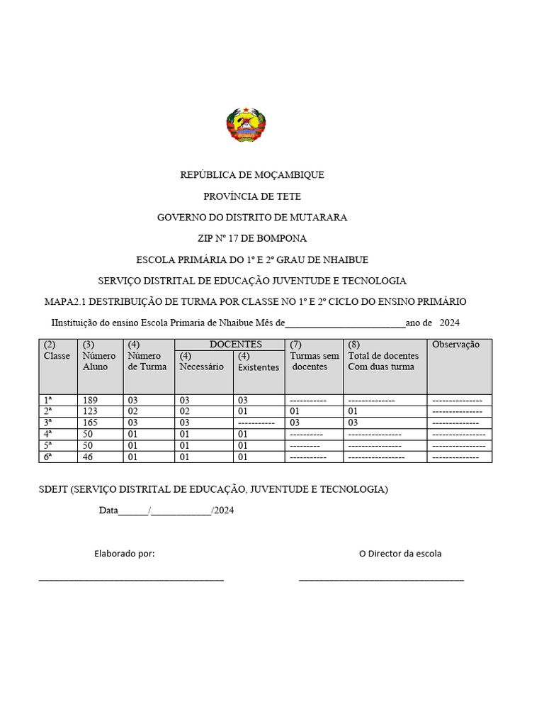 IInstituição do ensino Escola Primaria de Nhaibue Mês de________________________ano de 2024