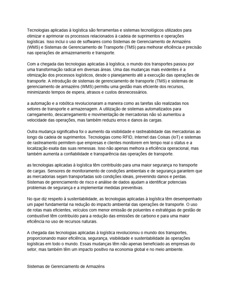 logísticas. Isso inclui o uso de softwares como Sistemas de Gerenciamento de Armazéns
