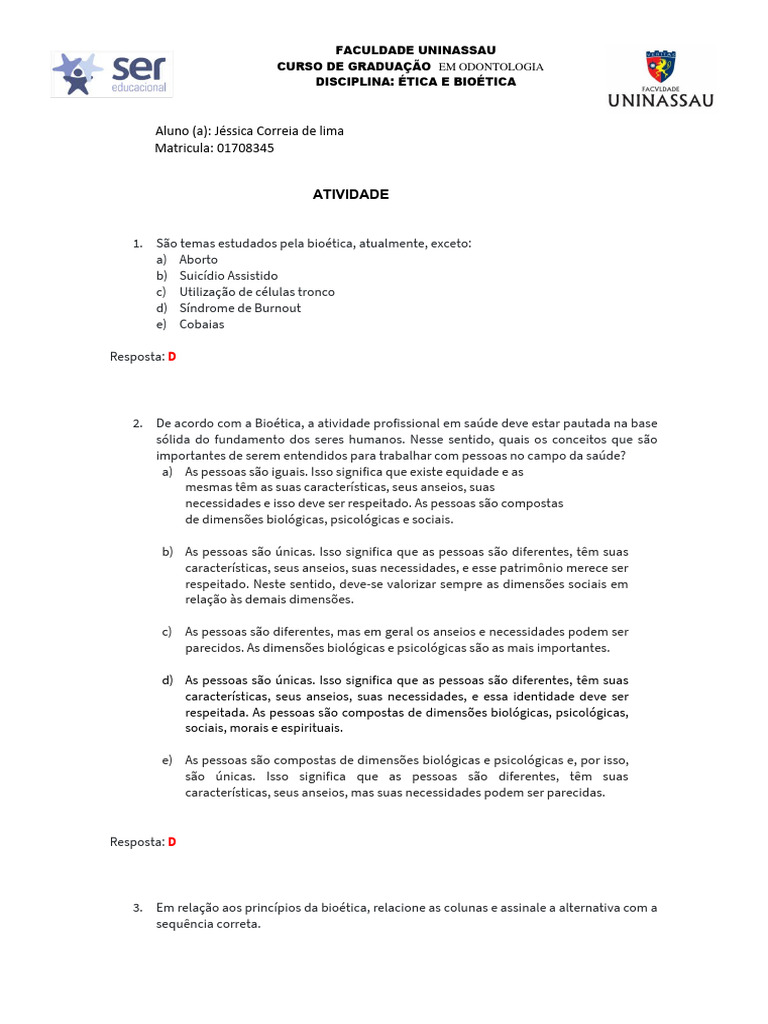 3. Em relação aos princípios da bioética, relacione as colunas e assinale a alternativa com a